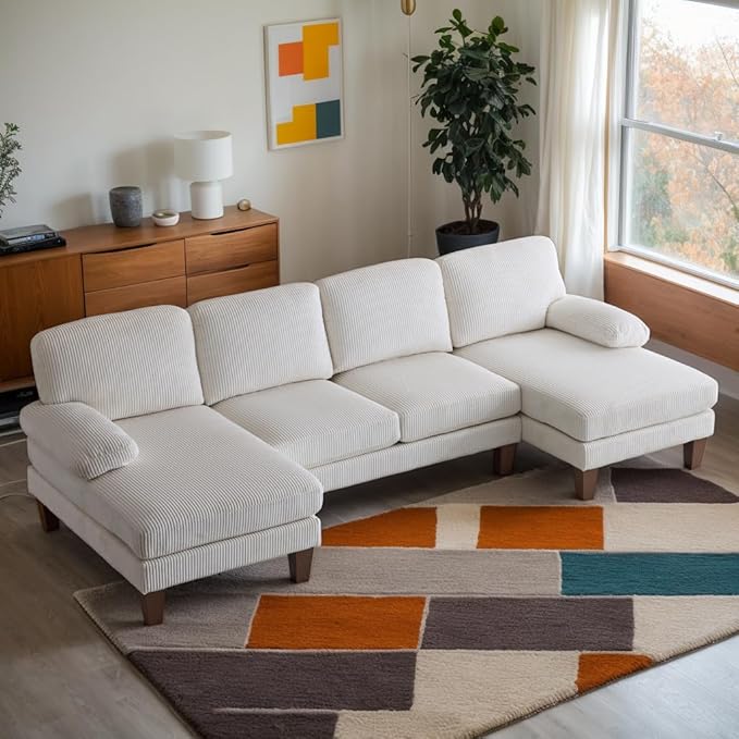 Karl home U-Shape Sectional Sofa Couch 111" Modern 4-Seat Sofa with Chaises Corduroy Fabric Upholstered Covertible Couch with Wood Grain Legs for Living Room, Reception Room, Apartment, Beige