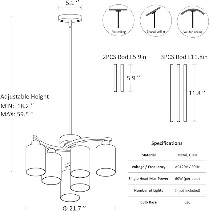 - [Height Adjustable]: Diameter: 21.7in, Height: 18.2~59.5in. Canopy Diameter: 5.1 in. Comes with two 5.9" and three 11.8" downrods, so you can flexibly adjust the hanging height of the foyer lighting fixtures. Sloped ceiling adaptable.