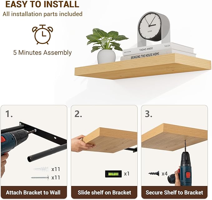 - 【Easy Installation】Designed with user convenience in mind, these shelves come with all necessary mounting hardware and clear instructions. You can have them up and ready to use in less than 5 minutes. Plus, our customer service is always ready to assist with any queries or concerns, ensuring a hassle-free experience