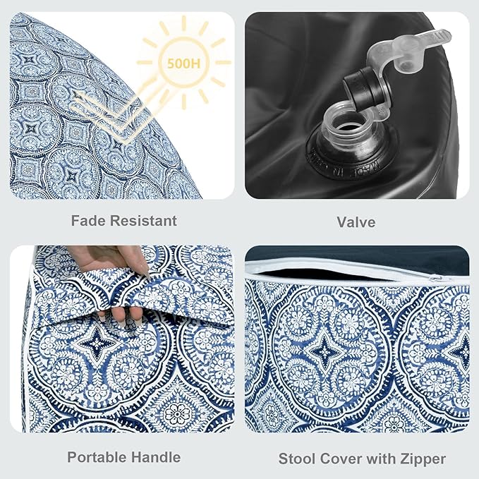 LVTXIII Outdoor Inflatable Ottoman, Fade-Resistant Round Footrest Stool D31”x H14”, Portable Patio Pouf for Garden Camping or Home Use, Medallion Blue