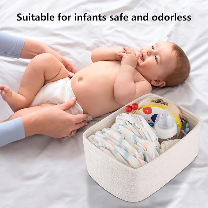 - [Premium Cotton Material]:Our cute baby storage baskets are made of high quality cotton hand-woven by workers, soft and odorless, no sharp edges and corners, very friendly to babies and pets, a good choice for baby-sitting baskets and dog or cat toy baskets