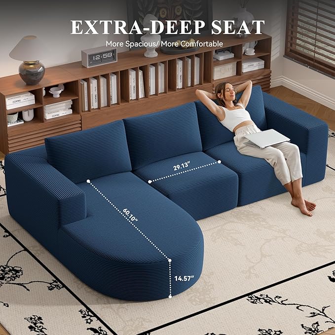 Modular Sectional Sofa with L-Shape Chaise,Cloud Sectional Modern Sleeper Couch with Deep Seat,Sponge Compression Sofas No Assembly Required (Blue-Corduroy Fabric) 1PCS