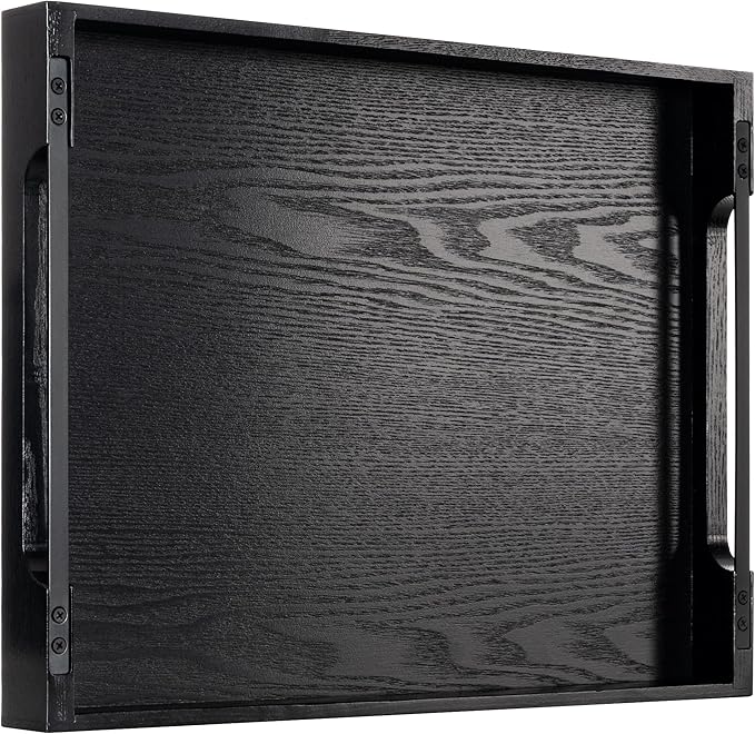 - Stunning and Practical Design: This black wooden tray features a unique blend of neutral wood and black metallic glossy finish, add a touch of sophistication to any space. The comfortable ergonomic grip and thicked metal handles allow for easy transport, while the raised edges prevent spills and mess