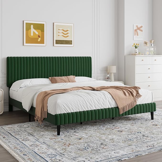 King Size Bed Frame, Velvet Upholstered Platform Bed with Vertical Channel Tufted Headboard and Footboard, No Box Spring Required, Easy Assembly, Green