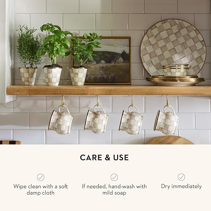MACKENZIE-CHILDS Enamel Herb Pots, Small Plant Pots for Herbs or Flowers, Set of 3, Brown-and-White Mocha Check