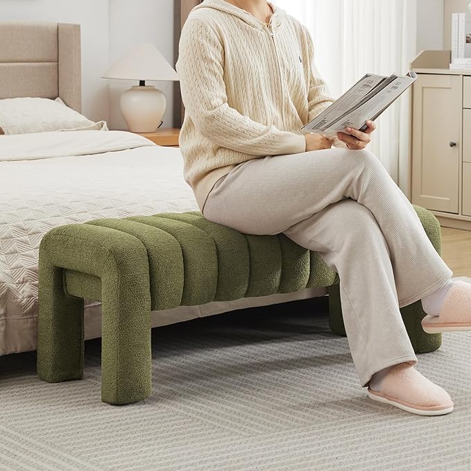 43.3" Bedroom Bench, Upholstered Entryway Bench, Modern End of Bed Ottoman with Solid Wood Legs and Adjustable Foot Pegs for Entryway, Dining Room and Living Room (Green Boucle)