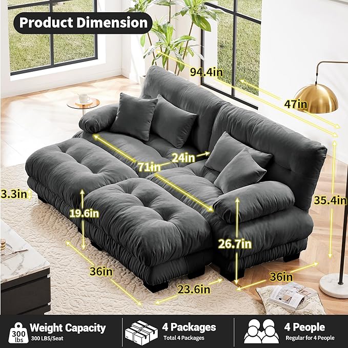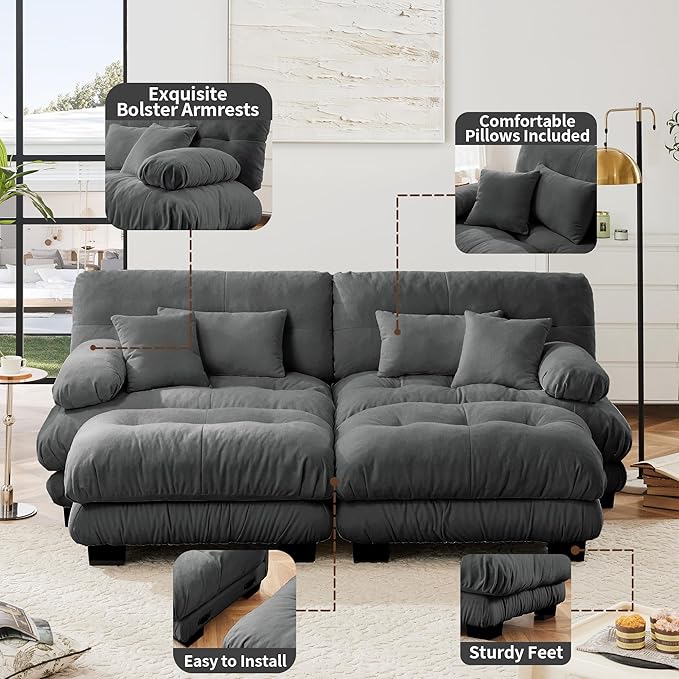 - Oversized U-Shaped Couch: This is a sectional couch that is a loveseat sofa with 2 ottoman. This 2-seater cloud couch is made of soft durable chenille fabric, it offers comfort and soft seating for everyone sitting on it. Exquisite round bolster armrest designs with well-filled inside provide comfort support for the hands, while sitting on it the bolster armrest can also provide your head with the appropriate radian and support