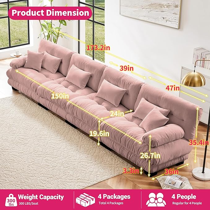 - Modular Sectional Sofa: This is an oversized sectional couch for living room. The 4-seater cloud couch is made of soft durable chenille fabric, it offers comfort and soft seating for everyone sitting on it. Exquisite round bolster armrest designs with well-filled inside provide comfort support for the hands, while sitting on it the bolster armrest can also provide your head with the appropriate radian and support