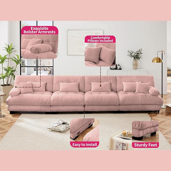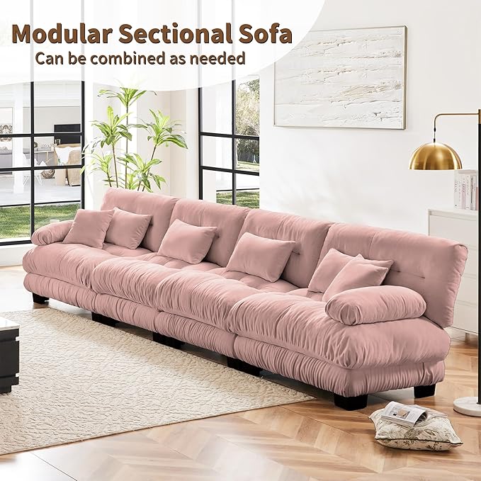 Modular Sectional Sofa Cloud Couch 4-Seater Deep Seat Sofa Couch, Oversized Couch Bed Sectional Couch with Round Bolster Armrests 6 Pillows, Modern Sofa Chair Comfy Couch(Pink)