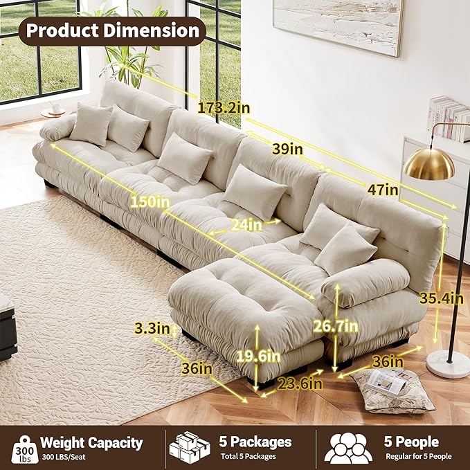 - Oversized L-Shaped Couch: This is a modern sectional couch with an ottoman. The 4-seater sofa couch is made of soft, durable, and exquisite vintage chenille fabric, it offers comfort and soft seating for everyone sitting on it. Exquisite round bolster armrest designs with well-filled inside provide comfort support for the hands, while sitting on it the bolster armrest can also provide your head with the appropriate radian and support