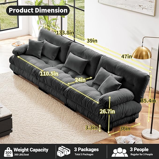 - Modular Sectional Sofa: This is an oversized sectional couch for living room. The 3-seater cloud couch is made of soft durable chenille fabric, it offers comfort and soft seating for everyone sitting on it. Exquisite round bolster armrest designs with well-filled inside provide comfort support for the hands, while sitting on it the bolster armrest can also provide your head with the appropriate radian and support