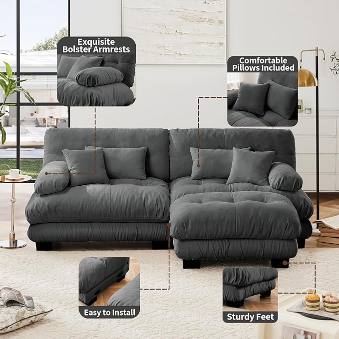 Loveseat Modular Sectional Sofa, L Shaped Couch with Ottoman, Cloud Couch Sectional Couch Home Sofa Living Room Oversized Couch Deep Seat Couch with Round Bolster Armrests 4 Pillows(Gray)