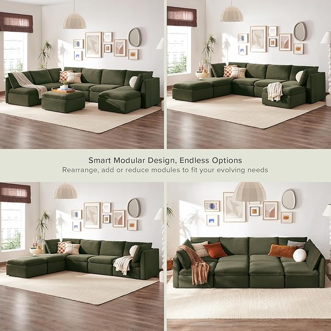 mopio Oversized Modular Sectional Sofa with Fully Removable Covers and Storage, Convertible U, L-Shaped and Sleeper Sectional, Modern Couches with Ottoman Chaise (Olive Green Velvet, 8 Seats, U)