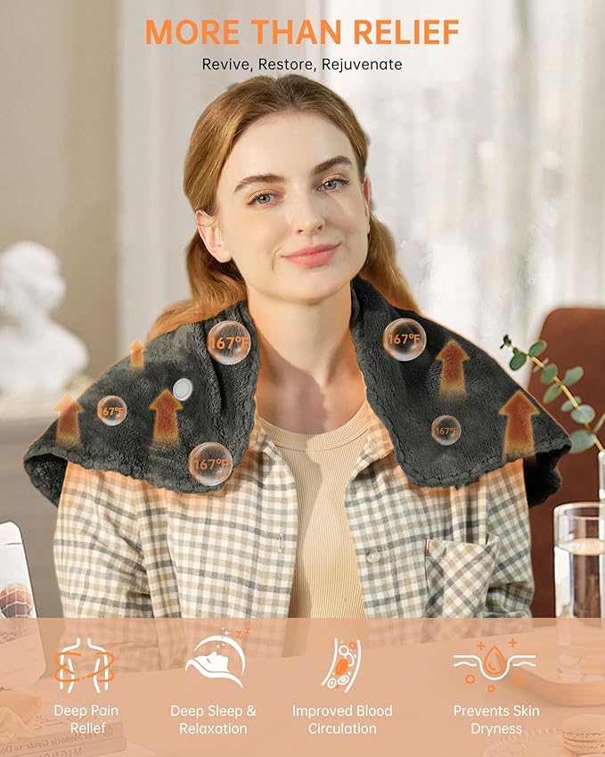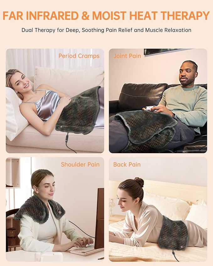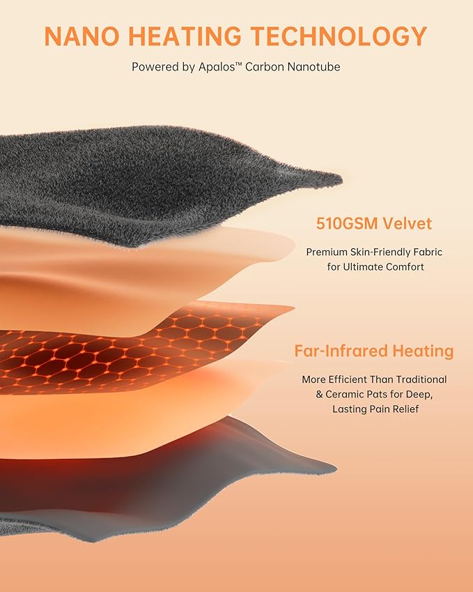 - More Efficient Pain Relief: Achieves far-infrared rapid heating in just 30s with a power consumption of only 30W, making it 80% more energy-efficient than other heating pads, saving about 1 kWh per day. The heat penetrates deeply into the skin and joints through infrared, without causing dryness. It helps effectively relieve menstrual cramps, back pain, neck pain, shoulder aches, and other joint discomfort.