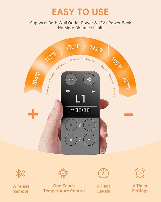 - More Practical: The Jartoo Nano heating pad is innovatively equipped with a separate wireless remote control to adjust 6 temperature levels (104°F-167°F) and 6 timer settings (30-360 mins). Additionally, you can directly control the temperature using the buttons on the heating pad, making it even more convenient to use.