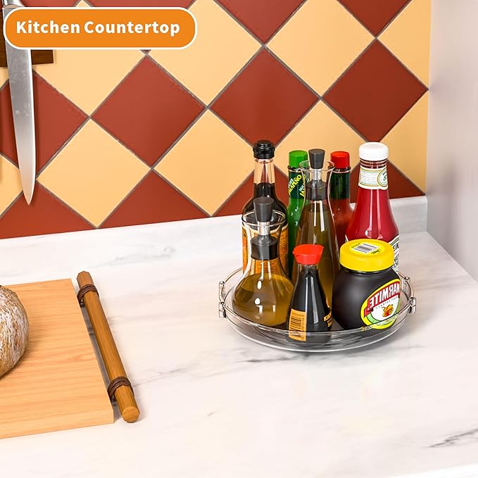- 【Used for hard to reach spaces】No more wasted food,jars,sauces and Condiment due to forgotten items,this turntable organizer allows for easy rotation and access to items even in the back, making it ideal for narrow and hard-to-reach spaces,Perfect spinning storage organizer for table, kitchen countertop, under the sink, cabinet closet, pantry, refrigerator, bathroom countertop, vanity makeup, office and more.
