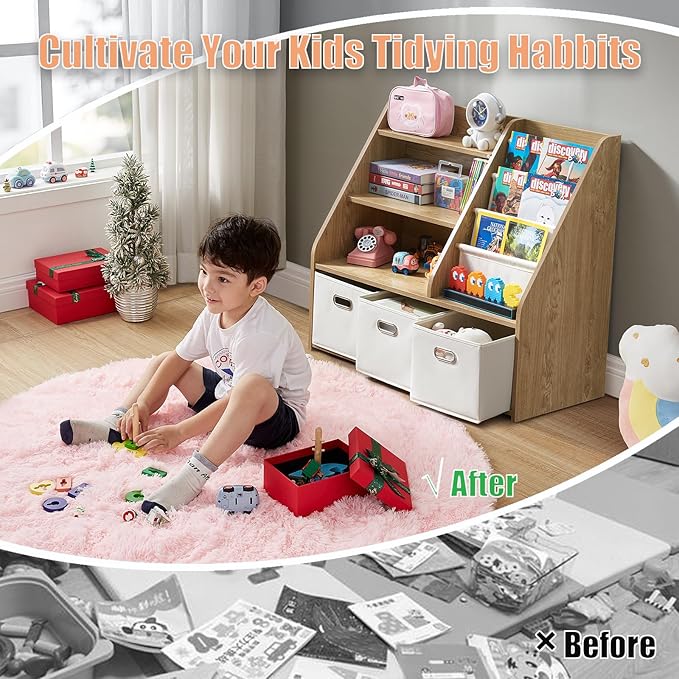 - ⭐️ [ All-in-One Storage Solution for Books & Toys] Features 3-tier fabric sling book rack, 3 open storage shelves, and 3 removable fabric bins — perfect for books, plush animals, blocks, dolls, art supplies, and more. Helps children develop good habits by making cleanup fun and simple.
