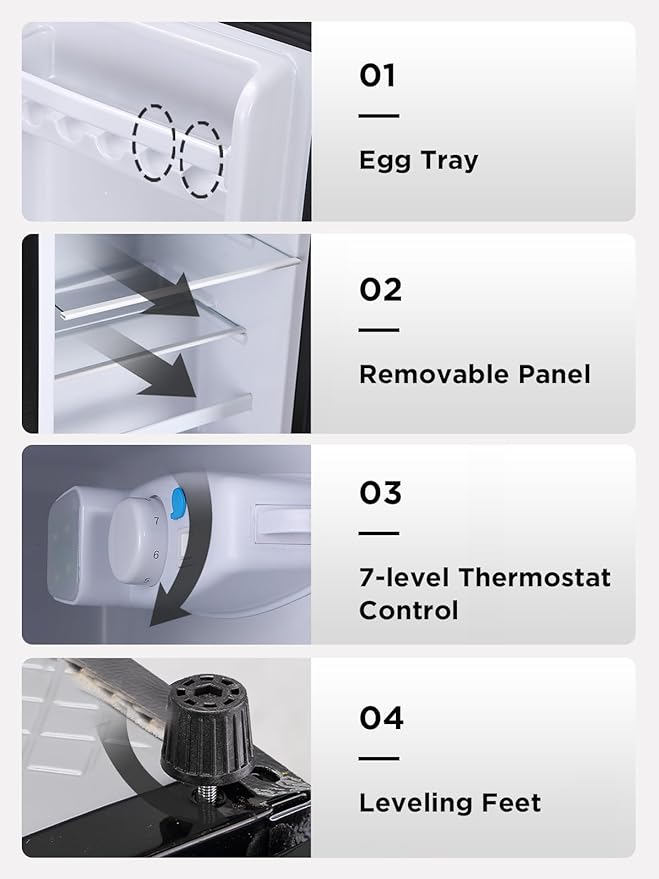 - Quiet & Energy-Efficient Operation: Designed for eco-conscious households, this compact refrigerator runs quietly at less than 40dB—quieter than a library whisper. Its energy-efficient design saves on electricity while keeping your space peaceful and undisturbed.