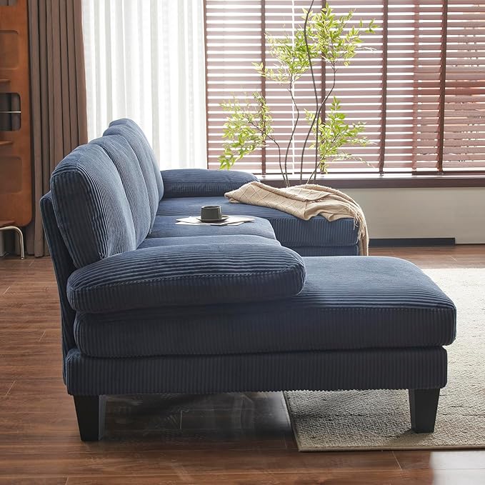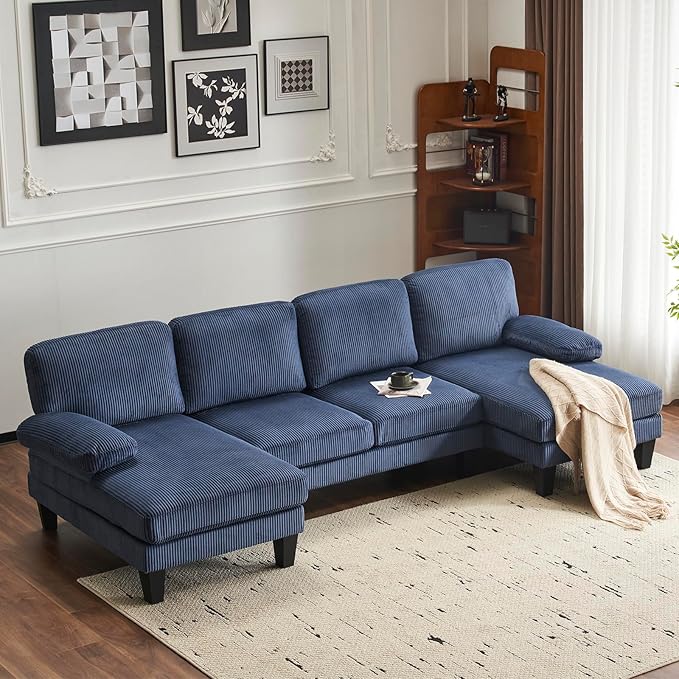 Karl home U-Shape Sectional Sofa Couch 111" Modern 4-Seat Sofa with Chaises Corduroy Fabric Upholstered Covertible Couch with Wood Grain Legs for Living Room, Reception Room, Apartment, Navy Blue