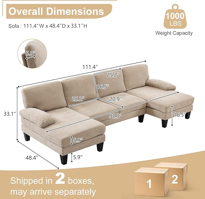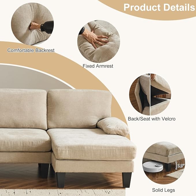 - SOFT & COMFORTABLE - When seated on the couch, you will experience the support of the high-resilience sponge in the seat and back. Occasionally, you can take a nap on the chaise. Covered with breathable fabric, this four-seat sofa offers physical and mental comfort.