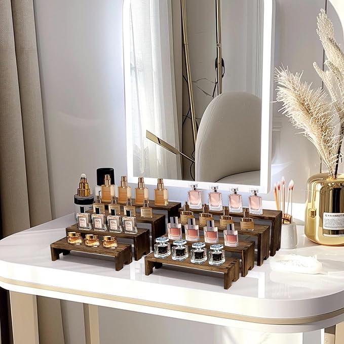- 【Large Wooden Tierd Risers for Display】🎁: This 2 set 4 tier display shelf for cupcakes or vendors has stackable nesting design, so the wooden display risers easily access as desktop storage racks,also they has strong load-bearing capacity for more kinds perfumes, collectible figures,kitchen condiment bottles, bathroom toiletries because of varieties size of (L8.6''/22cm-9.4''/24cm-10.2''/26cm-11''/28cm)XW3.14'' /8cm
