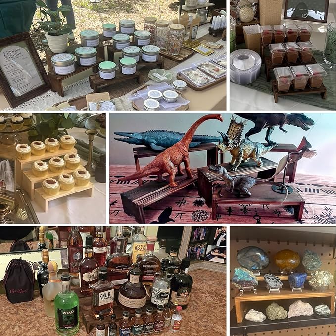 - 【Tierd Display Stands for Vendor】🎁: First they are no need any tools then can be used directly! very convenient to display more items for vendors, they are not only beatiful but also improve space utilization rate, U-shaped wood risers, fire-carbonized, durable, non-toxic, odorless, and no deformation, nested design for easy storage in living room,bedroom,kitchen,indoor,outdoor, also can be used individually or as a set.
