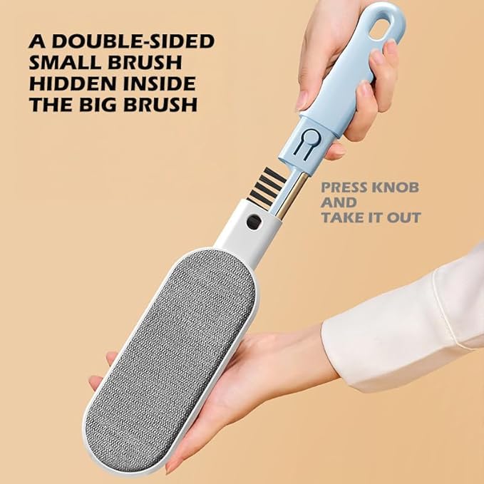 - 2. Multi-Functions 4 functions brush. One side of the brush body has soft burrs that can easily brush away pet hair, and the other side has plastic hard spikes that can brush away adhesive and hard hair. The handle can be pulled out of the brush body to become a double-sided small brush, with bristles on one side and a steel wire hard brush on the other side, which can easily remove hair and dust in the gaps.