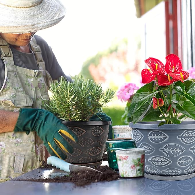 - 【Excellent Drainage and Trayeach 】plastic pots for plants comes with a tray and multiple drainage holes, excess water will flow out of the drainage holes at the bottom of the large flower pots to prevent overwatering. The plant pots outdoor tray collects spilled water and soil for easy cleanup.