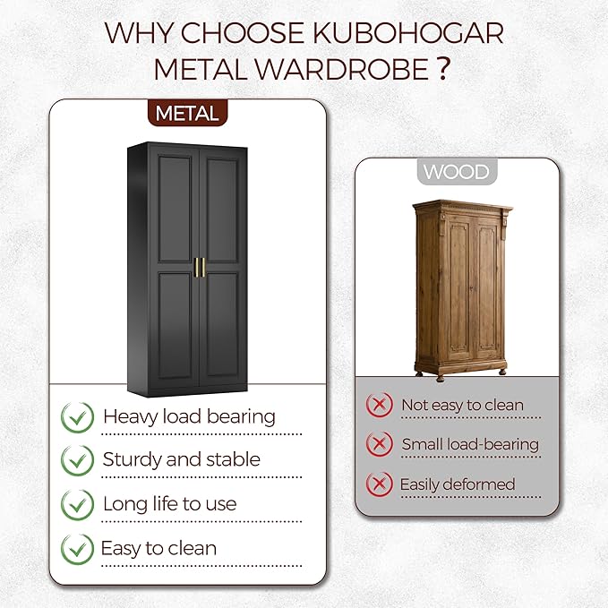 - High quality material: The armoire wardrobe closet is made of thickened cold-rolled steel plate, which is strong and not easy to deform. The metal wardrobe cabinet is treated with environmentally friendly powder coating, which is resistant to moisture, corrosion and rust, and is more durable than wooden cabinets.