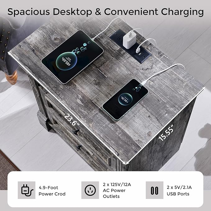 - CONVENIENT CHARGING STATION: Farmhouse nightstand featuring a built-in charging station. Equipped with 2 USB ports and 2 AC power outlets, it ensures your devices are always charged and ready to go. The back panel includes a 2.3-inch diameter cable management hole, keeping your space neat and organized. With a spacious tabletop, you have plenty of room for your essentials and favorite decor