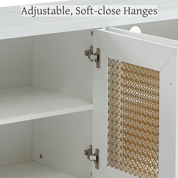 JYED Mid Century Modern TV Stand for TVs up to 75", 69.5" W White Entertainment Center with 4 Gold Metal Mesh Doors - Wood Grain MDF TV Console, Media Storage
