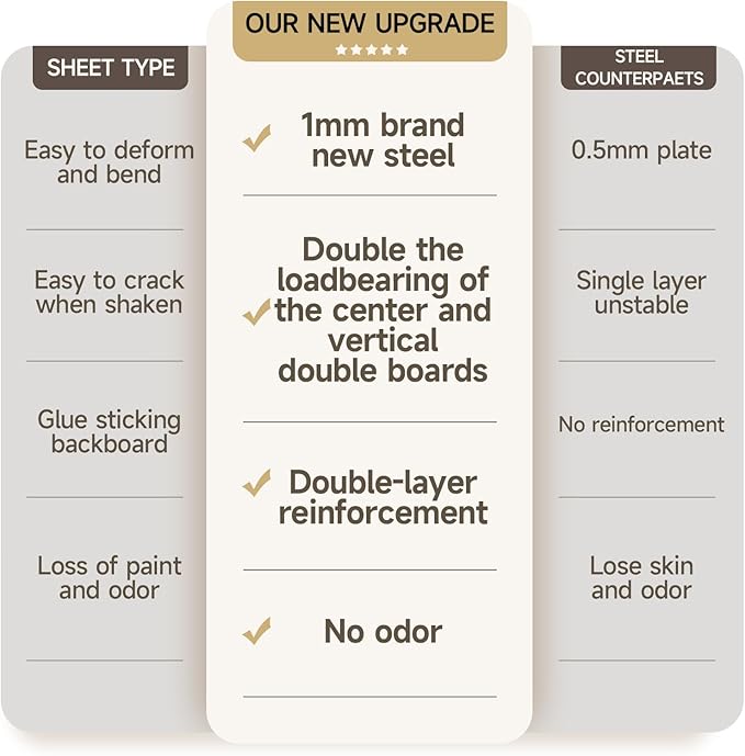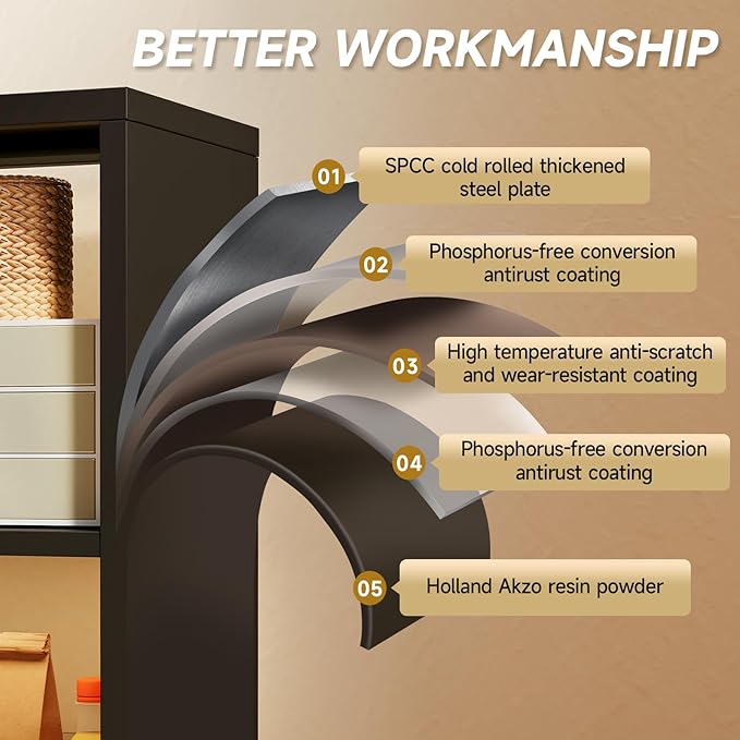 - Sturdy Steel Construction:Made with 0.7mm premium cold-rolled steel for enhanced durability, resistant to deformation. Features anti-tipping stability and adjustable feet to balance uneven floors while protecting surfaces. Sleek, screw-free design ensures a smooth, modern aesthetic
