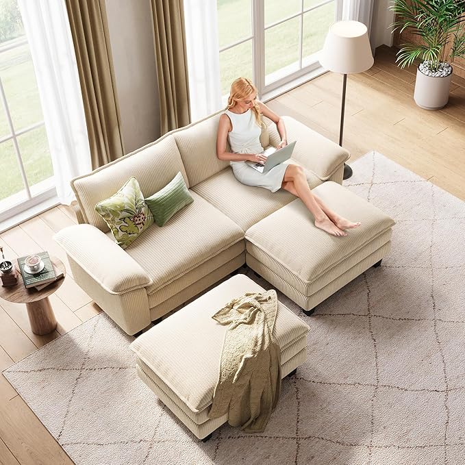 LINSY HOME Sectional Sleeper Sofa - 90'' Modular Cloud Couch Oversized Corduroy Sofa Bed with Movable Ottoman Soft Modern Comfy Couch Set for Living Room Apartment Office, Beige