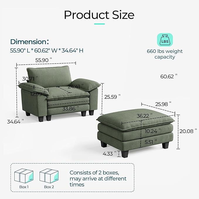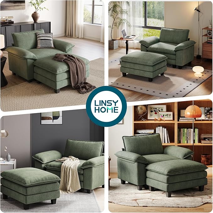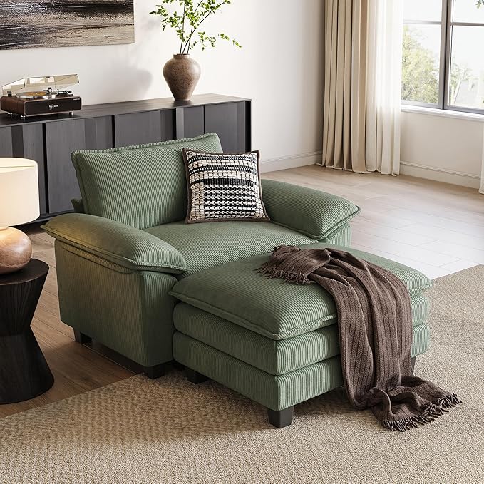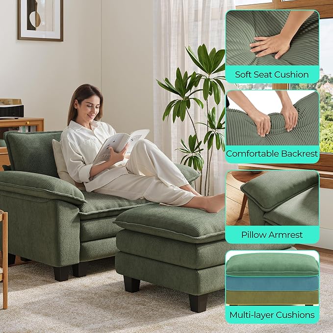LINSY HOME Sofa Chair with Movable Ottoman - Corduroy Cloud Couch Chair Soft Comfy Modern Sofa Chaise Single Sleeper Chair Bed for Living Room Apartment Office, Green