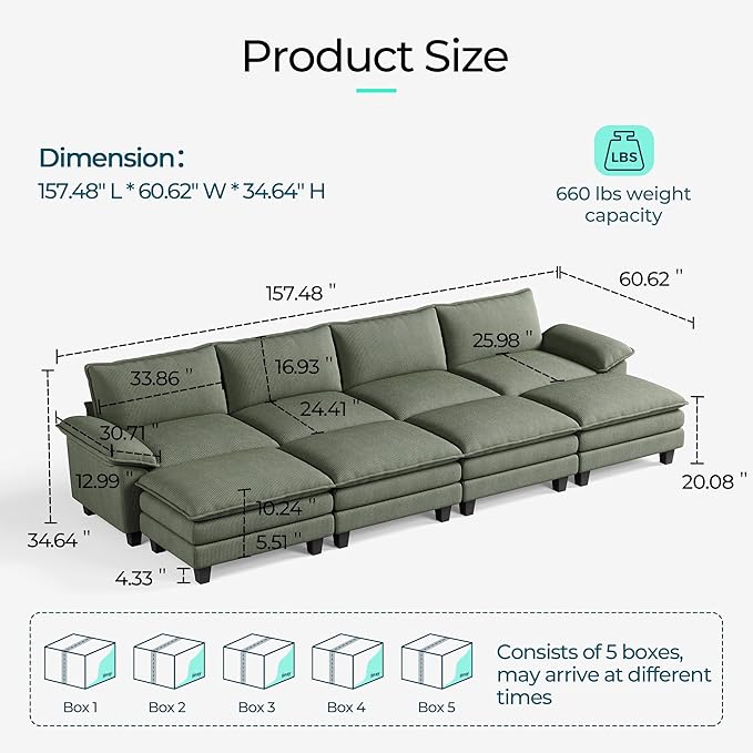LINSY HOME Modular Sectional Sofa - 157'' Sleeper Sofa Cloud Couch Oversized Corduroy Sofa Bed with Movable Ottoman Soft Modern Comfy Couch for Living Room Apartment Office, Green