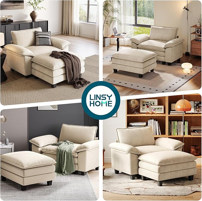 LINSY HOME Sofa Chair with Movable Ottoman - Corduroy Cloud Couch Chair Soft Comfy Modern Sofa Chaise Single Sleeper Chair Bed for Living Room Apartment Office, Beige