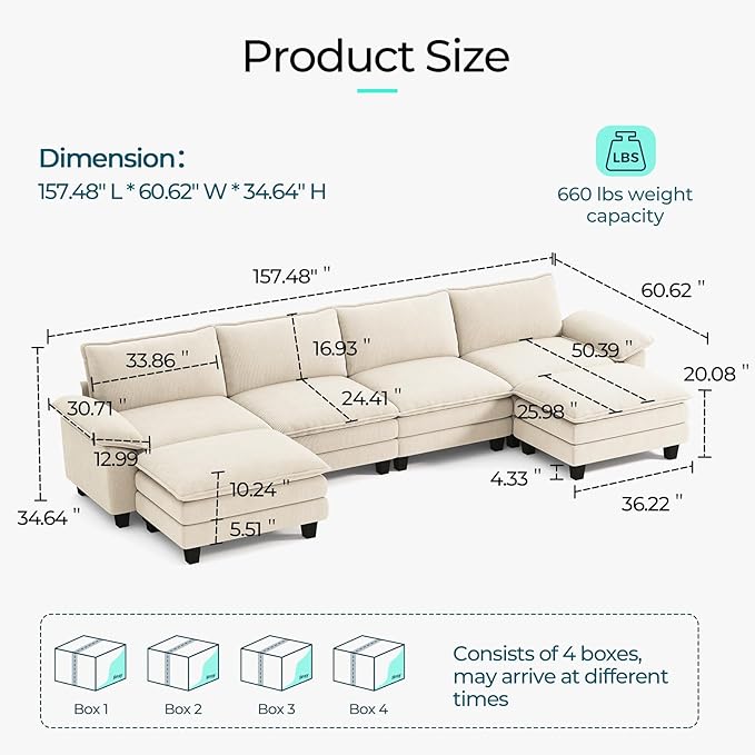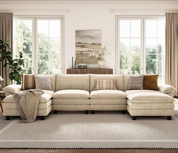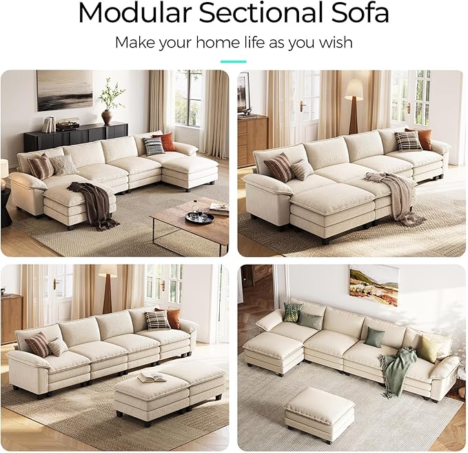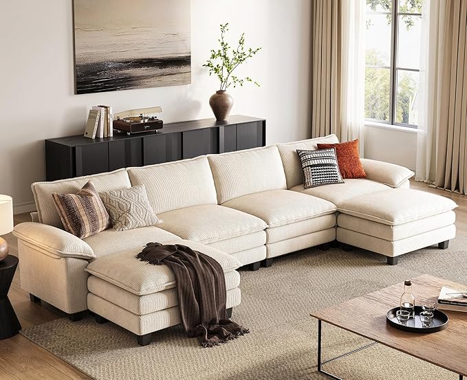 LINSY HOME Modular Sectional Sofa - 157'' Comfy Corduroy Cloud Sofa Oversized U Shaped Couch with Movable Ottoman, Soft Modern Sofa for Living Room Apartment, Beige