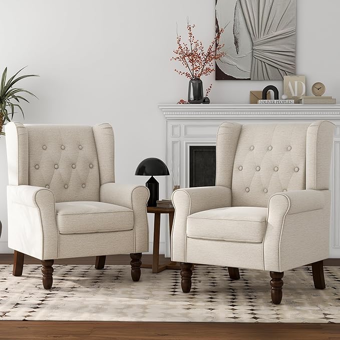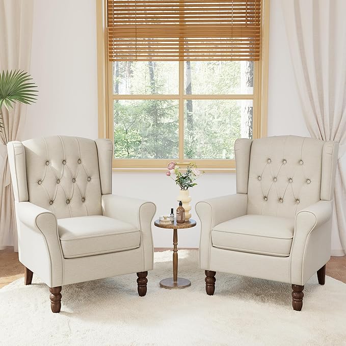 Lumibee High Back Accent Chair Set of 2,Upholstered Wingback Armchair with Solid Wood Legs for Small Spaces,Comfy Single Sofa Chair for Living Room,Bedroom,Office-Beige
