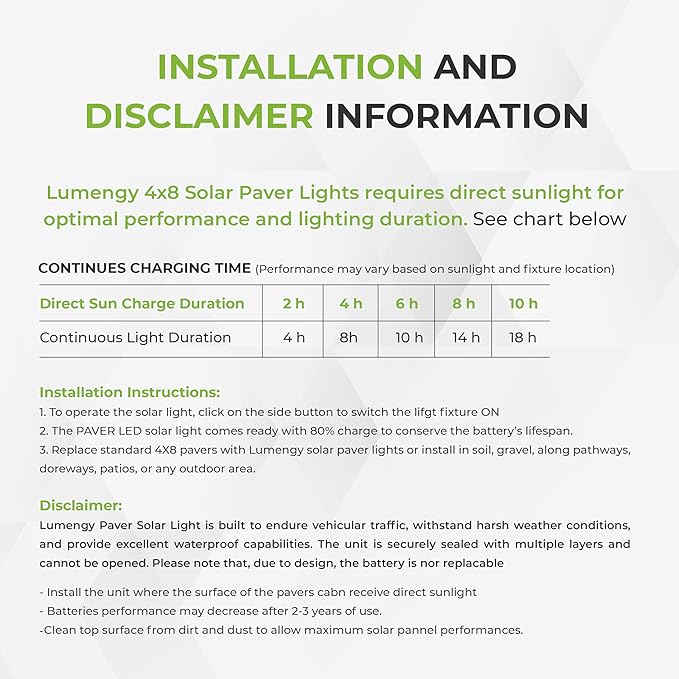 - Package Included – One 4×8 solar-powered paver light and an installation manual.