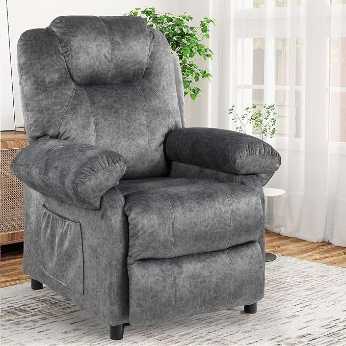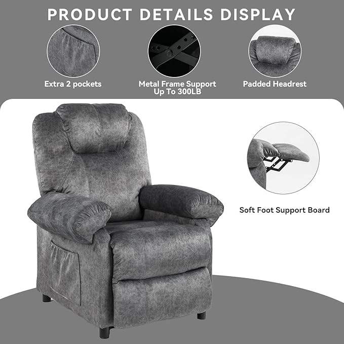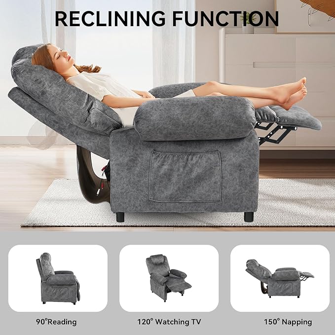 - Massage Recliner Chair : The grey recliner chair is adjustable between 90-150 degrees. You can choose to adjust the recliner to the right position to reduce stress and body pain, such as: massage, rest, listen to music, watch TV, sleep or lie down, our recliners are perfectly matched to your different needs