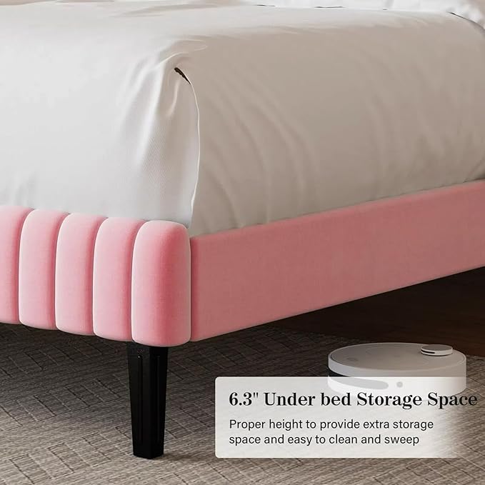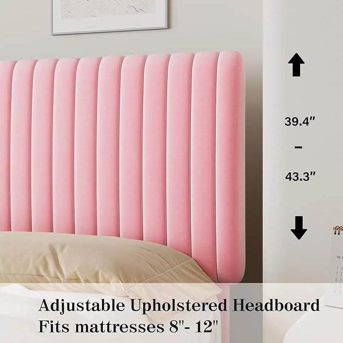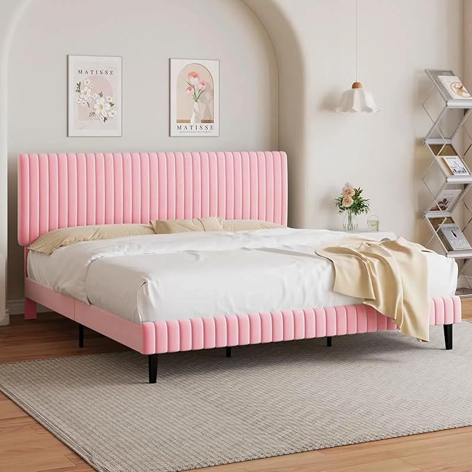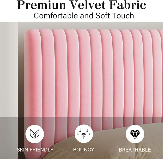 King Size Bed Frame with Headboard, Velvet Upholstered Platform Bed with Vertical Channel Tufted Design, No Box Spring Required, Easy Assembly, Pink