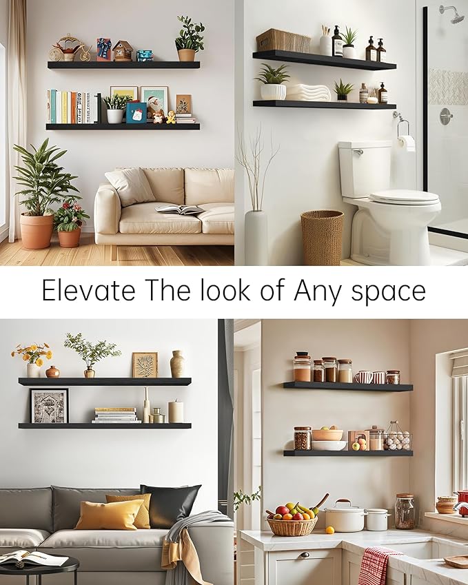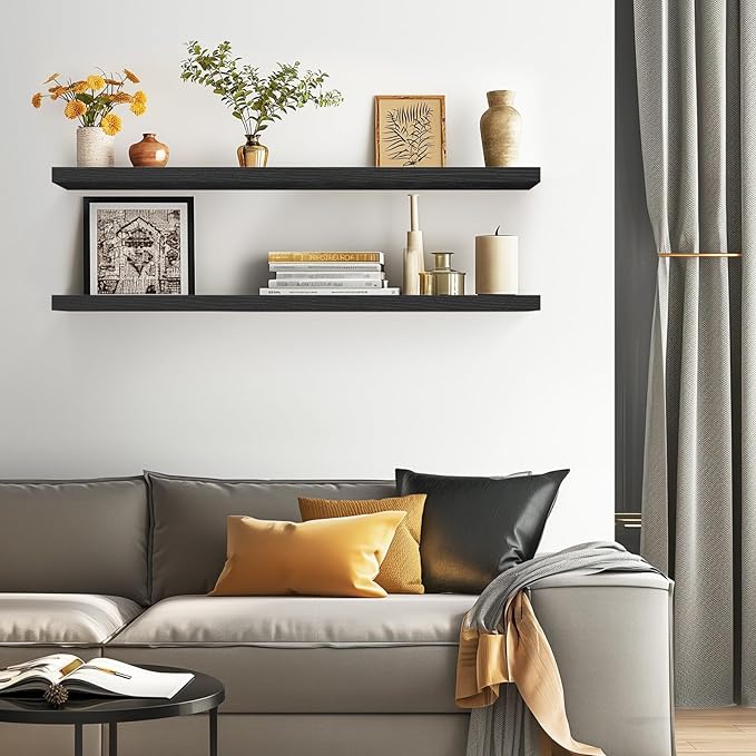 BAYKA Floating Shelves, 48 inches Long Heavy Duty Wall Mounted Rustic Wood Shelves for Bathroom, Bedroom, Living Room, Kitchen, Office, Hanging Shelf for Books/Storage/Decor(Black,Set of 2)