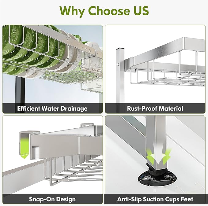 - π© Sturdy & Rust Resistant Construction: Crafted with heavy duty stainless steel and reinforced welding, this over the sink dish drainer drying rack resists corrosion and daily wear. Its industrial grade framework securely holds bulky pots, pans, and dishware without sagging, even when fully loaded, ideal for families seeking a lasting solution to countertop clutter