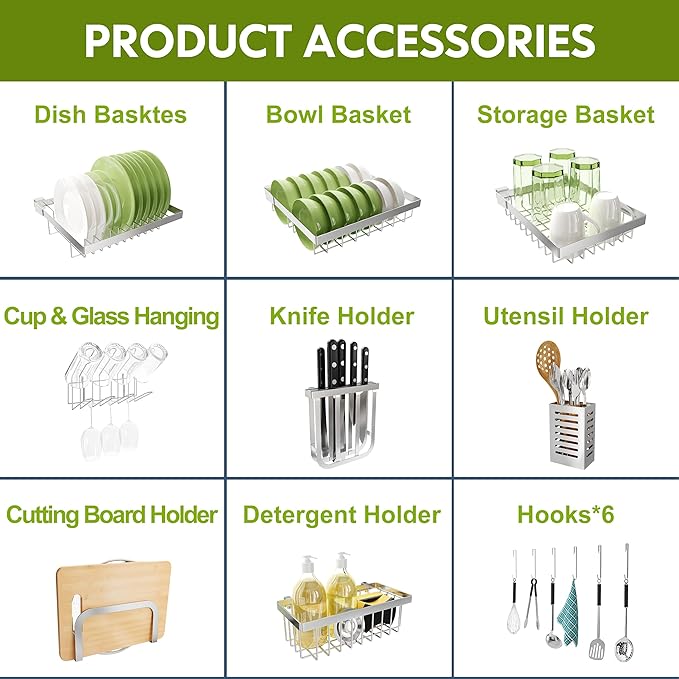 - π§½ Hygienic & Easy Clean Grid Design: The seamless stainless steel surface prevents grime buildup, while the open grid metal dish drying rack structure allows quick wiping without disassembly. Removable accessories fit in sinks for deep cleaning, perfect for households prioritizing kitchen sanitation