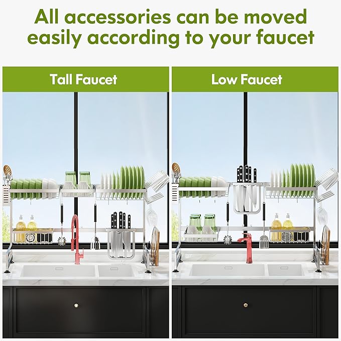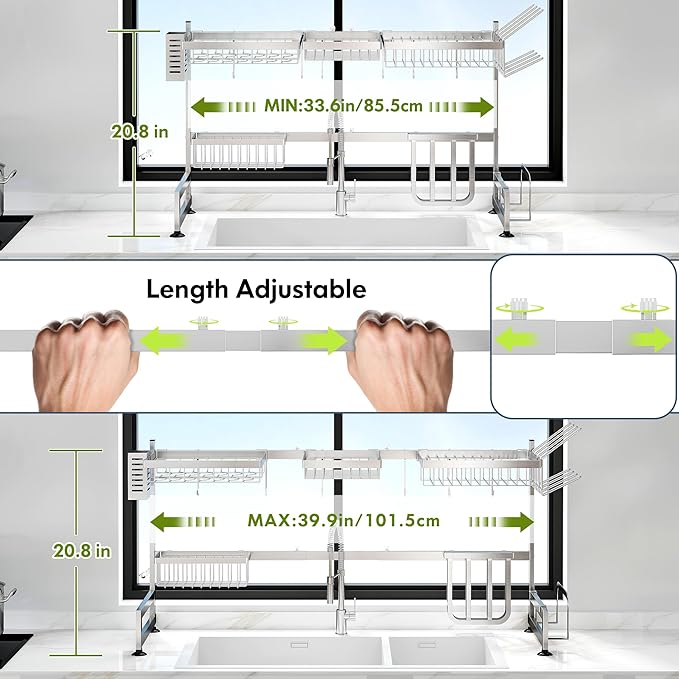 - π Expandable Design for Custom Fit: Adjust the over sink dish drying rack width effortlessly to span most standard single or double sinks, adapting seamlessly to your kitchen layout. The dish drain modular design allows rearranging tiers and accessories to prioritize space for tall glasses, wide pans, or cleaning tools, maximizing vertical storage above the sink