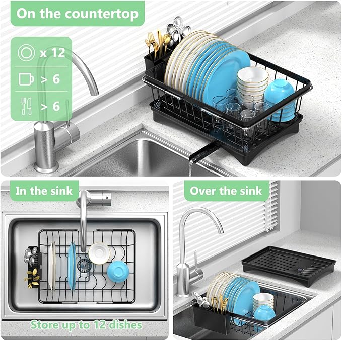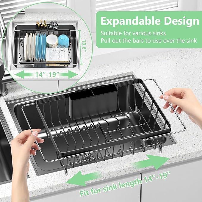 - EXPANDABLE DESIGN: LEMIKKLE expandable Dish Drying Rack Over The Sink measures 14.5"L x 10.6"W x 4"H (Please check the dimension before purchase, the size is mini), the supporting bars is adjustable from 14” to 19.2”. With the compact size and expandable design, this dish drying rack is a perfect choice for 2-4 people or limited spaceEXPANDABLE DESIGN: LEMIKKLE expandable Dish Drying Rack Over The Sink measures 14.5"L x 10.6"W x 4"H (Please check the dimension before purchase, the size is mini), the supporting bars is adjustable from 14” to 19.2”. With the compact size and expandable design, this dish drying rack is a perfect choice for 2-4 people or limited space