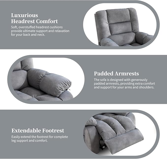 - 【Premium Comfort & Support】Stuffed with high-density foam, this recliner provides optimal softness and ergonomic support. Upholstered in durable, breathable fabric, it offers a luxurious feel while being and long-lasting. The sturdy construction ensures years of dependable use.