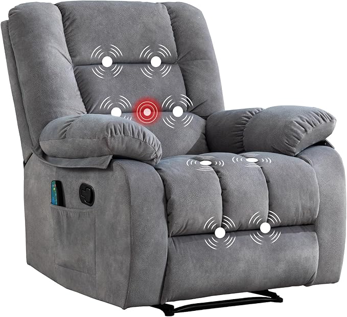 - 【Massage & Lumbar Heating】Relax in comfort with 8-point massage functionality and lumbar heating. This recliner targets key areas for your back, lumbar, thighs and legs to improve blood circulation, relieve tension, and reduce fatigue. Choose from 3 massage modes and adjustable intensity levels to customize your relaxation. The built-in timer lets you set 15, 30, or 60-minute heating sessions for convenience.