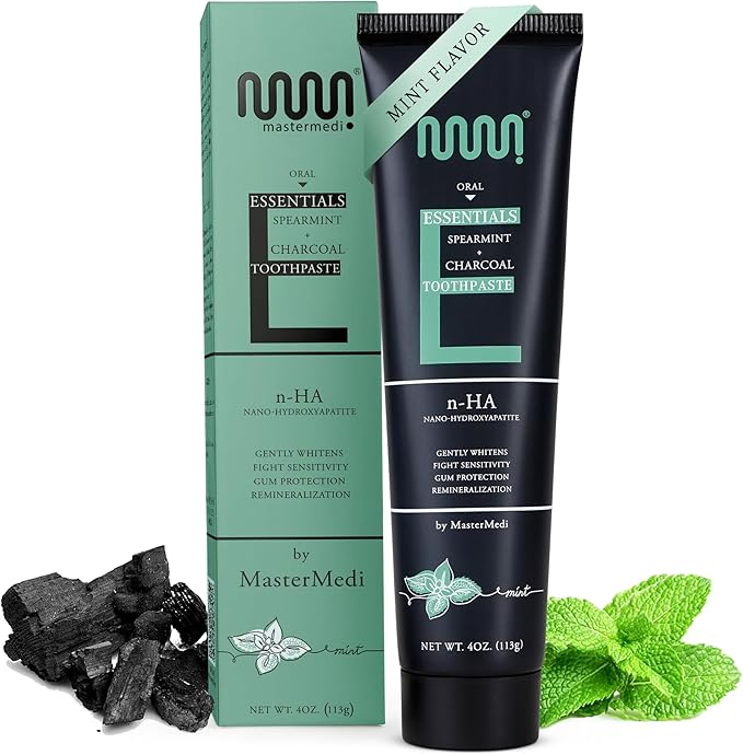 MasterMedi Charcoal Toothpaste with Nano Hydroxyapatite – Fluoride Free, SLS Free, Sensitive Whitening, Enamel Support, Spearmint Flavor, Dentist Recommended, 4 oz (Pack of 1)