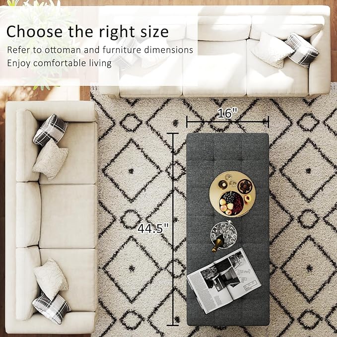 Large Rectangular Upholstered Ottoman Bench, Linen Tufted Footrest Ottoman with Solid Wood Shelf Storage Coffee Table for Bedroom Living Room, Dark Gary